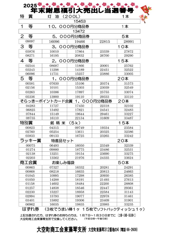 2025年末謝恩福引大売出し 当選発表 2026 1/07 未分類 2026年1月7日 当選番号は以下の通りとなります。 豪華景品を多数用意しています。お手元の抽選券をご確認ください。 未分類 年末年始 営業&お買物情報