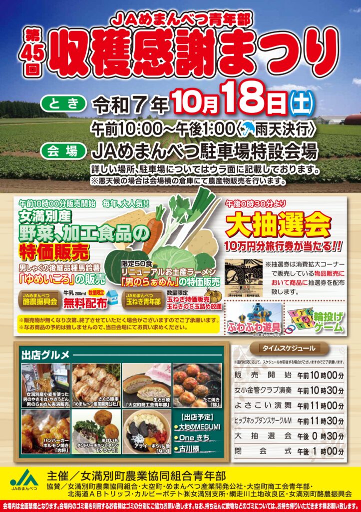 JAめまんべつ青年部 第45回 収穫感謝まつり 2025 10/08 すべての皆様へ 商工会会員向け情報 商工会青年部 大空町情報 女満別地区情報 2025年10月8日 商工会青年部も出展します。すがの商店の「生どら」や「くじ引き」です。よろしくお願いいたします。 すべての皆様へ 商工会会員向け情報 商工会青年部 大空町情報 女満別地区情報 イベント セール 北海道 収穫 商工会青年部 大空 大空町 女満別 青年部 かに まるごと 感謝祭!!【そらっきーポイントカード会】 【おおぞら歌謡ショー2025】座席申込状況(10/14 9:00)